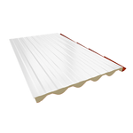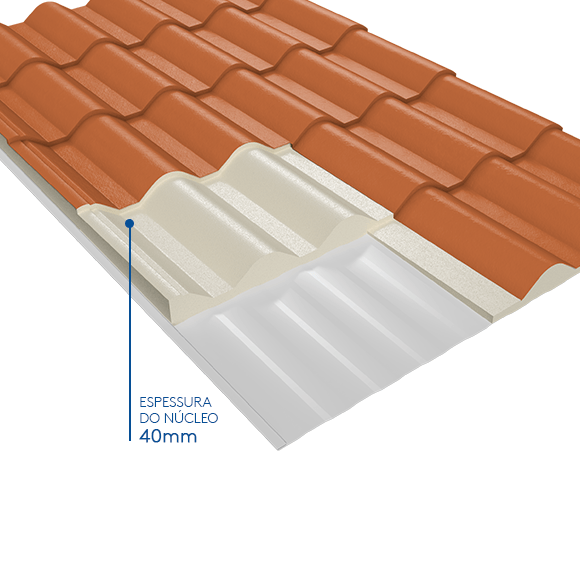 - Camada intermediária (núcleo) em espuma rígida de Poliisocianurato (PIR) de 40 mm nas ondas altas: mantém a temperatura interna estável, reduz a transferência de calor entre o ambiente interno e o externo e contribui para a eficiência térmica e o menor uso de sistemas de climatização.