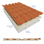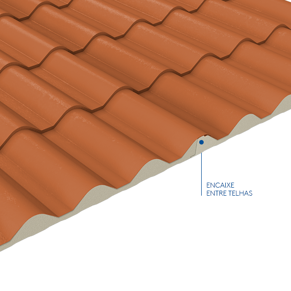 - Camada externa em Aço Galvalume com textura crinkle e brilho reduzido: protege o telhado contra chuva, granizo, vento e radiação solar. Altamente resistente e durável, garante a integridade da cobertura e proporciona o visual característico das telhas coloniais tradicionais.